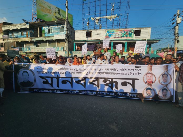 কালীগঞ্জ (ঝিনাইদহ) সংবাদদাতা॥ ঝিনাইদহ-৪ আসনের সংসদ সদস্য আনোয়ারুল আজীম আনার হত্যায় জড়িতদের দৃষ্টান্তমূলক শাস্তির দাবিতে মানববন্ধন কর্মসূচি পালিত হয়েছে।