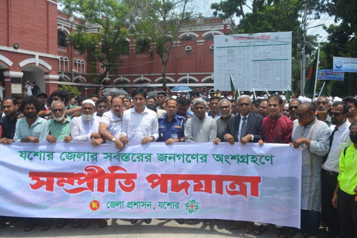 স্টাফ রিপোর্টার ॥ যশোরের সার্বিক আইনশৃঙ্খলা পরিস্থিতি উন্নতির জন্যে সর্বসাধারণের মধ্যে সচেতনতা সৃষ্টির লক্ষ্যে সম্প্রীতি পদযাত্রা অনুষ্ঠিত হয়েছে। বৃহস্পতিবার বেলা ১২ টার দিকে যশোর কালেক্টরেট চত্বও থেকে এ সম্প্রীতি পদযাত্রা বের হয়। পদযাত্রায় যশোরের সব রাজনৈতিক দল ছাড়াও বিভিন্ন শ্রেণিপেশার মানুষ অংশ নেন।