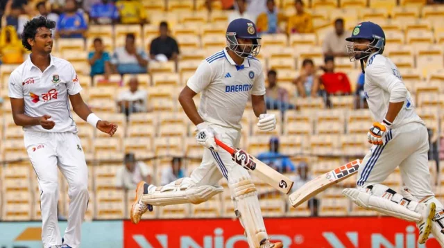 এরপর মেহেদি মিরাজ আর নাহিদ রানা তুলে নিলেন যথাক্রমে লোকেশ রাহুল (১৬) আর ওপেনার যশস্বী জয়সোয়ালকে (৫৬)। ১৪৪ রানে ৪ উইকেট নেই ভারতের। ঠিক সেই সময়েই পাল্টা আক্রমণ শুরু করলেন অশ্বিন-জাদেজা। ৫৮ বলে ফিফটি করা অশ্বিন ক্যারিয়ারের ৬ষ্ঠ টেস্ট সেঞ্চুরি তুলে নেন ১০৮ বলে। দিনশেষে তিনি ১০২ রানে অপরাজিত। অন্যদিকে ৭৩ বলে ফিফটি করা জাদেজা অপরাজিত ৮৬* রানে।