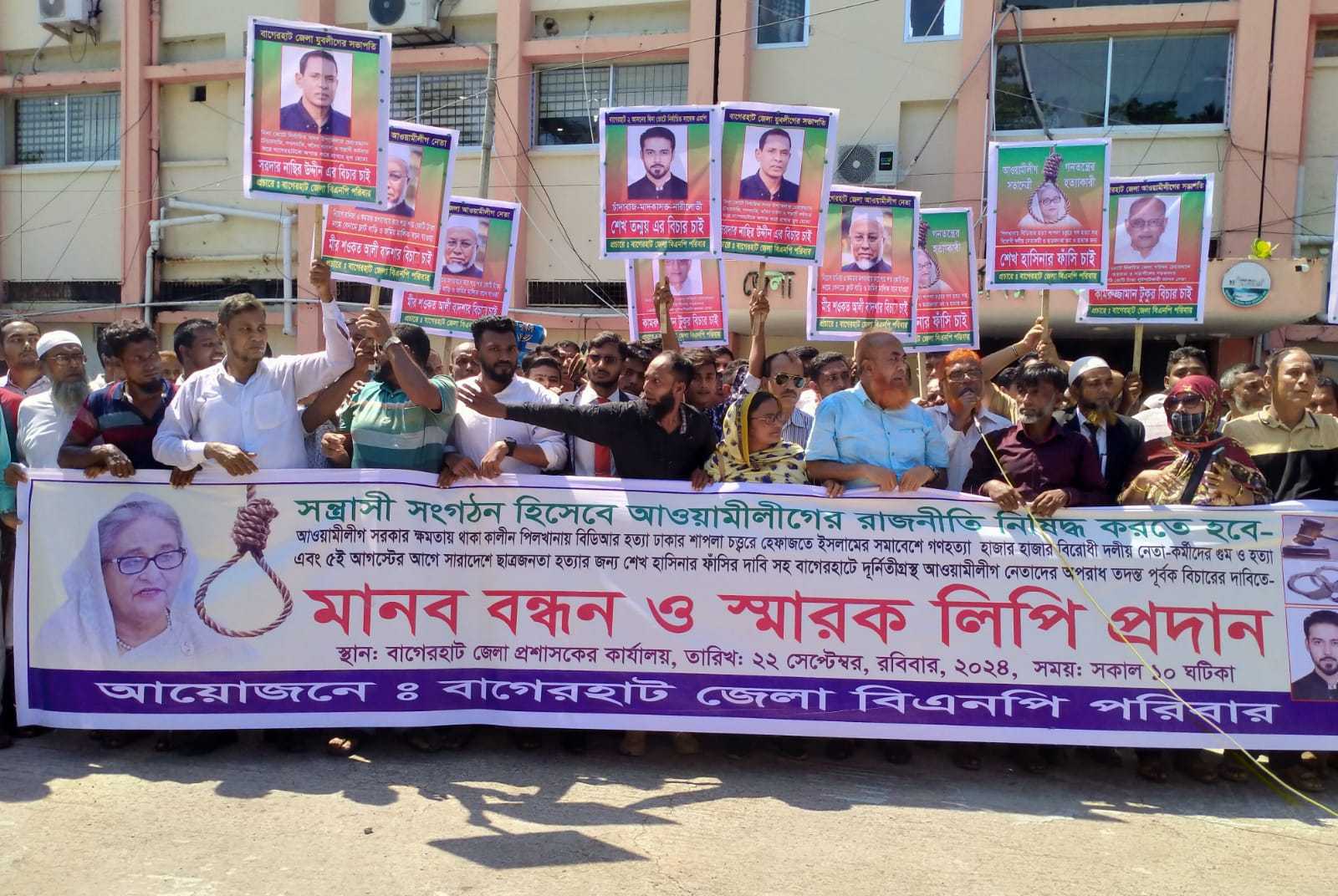বাগেরহাট সংবাদদাতা॥ বাগেরহাটে শেখ হাসিনা, শেখ তন্ময়, শেখ হেলালসহ আওয়ামী লীগের দোসরদের বিচার এবং ফাঁসির দাবিতে বিক্ষোভ মিছিল ও মানববন্ধন কর্মসূচি পালিত হয়েছে। রোববার সকালে জেলা প্রশাসকের কার্যালয়ের সামনে বাগেরহাট জেলা বিএনপি পরিবারের ব্যানারে এই কর্মসূচি পালিত হয়। পরে অন্তর্বর্তীকালীন সরকারের প্রধান উপদেষ্টা বরাবরে জেলা প্রশাসক আহমেদ কামরুল হাসানের কাছে স্মারকলিপি প্রদান করেন বিএনপির নেতারা।