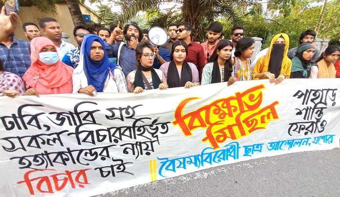 ঢাকা বিশ্ববিদ্যালয় জাবি সহ সকল বিচারবহির্ভূত হত্যাকাণ্ডের ন্যায় বিচারের দাবিতে। গতকাল প্রেসক্লাব যশোরের সামনে বৈষম্য বিরোধী ছাত্র আন্দোলনের যশোরের নেতৃবৃন্দ বিক্ষোভ মিছিল শেষে বক্তব্য রাখেন।