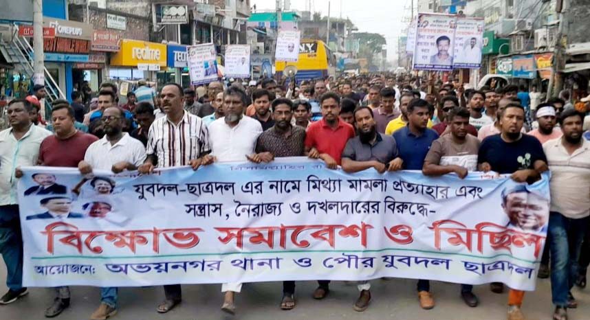 স্টাফ রিপোর্টার, অভয়নগর (যশোর)॥ যশোরের অভয়নগরে যুবদল ও ছাত্রদলের নেতাকর্মীদের নামে ষড়যন্ত্রমূলক ‘মিথ্যা’ মামলা প্রত্যাহার এবং সন্ত্রাস নৈরাজ্য ও দখলদারদের বিরুদ্ধে বিক্ষোভ সমাবেশ ও মিছিল অনুষ্ঠিত হয়েছে। সোমবার বিকেলে অভয়নগর থানা ও পৌর যুবদল ছাত্রদলের আয়োজনে নওয়াপাড়া বাজারে এ বিক্ষোভ সমাবেশ ও মিছিল অনুষ্ঠিত হয়। মিছিলটি নওয়াপাড়া স্টেশন বাজার থেকে শুরু করে যশোর-খুলনা মহাসড়কের পুরাতন বাসস্ট্যান্ড এলাকা প্রদক্ষিণ করে একই স্থানে এসে শেষ হয়।
