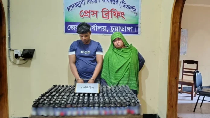 লোকসমাজ ডেস্ক ।। চুয়াডাঙ্গার দর্শনায় ২৮০ বোতল ফেন্সিডিলসহ শাশুড়ি চায়না খাতুন (৩৭) এবং জামাই রাজা মিয়াকে আটক করেছে যৌথবাহিনীর সদস্যরা।