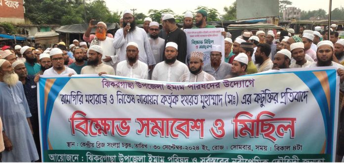 ঝিকরগাছা (যশোর) সংবাদদাতা॥ ভারতের মহারাষ্ট্রের হিন্দু পুরোহিত রামগিরি মহারাজ ও নিতেষ নারায়ণ হজরত মুহাম্মদ (রাসুল স.) এঁর নামে কটূক্তি করার প্রতিবাদে ঝিকরগাছায় ইমাম পরিষদের উদ্যোগে বিক্ষোভ মিছিল ও সমাবেশ অনুষ্ঠিত হয়েছে। সোমবার বিকেলে যশোর-বেনাপোল মহাসড়কের ঝিকরগাছা বাজারে সমাবেশে সভায় সভাপতিত্ব করেন, উপজেলা ইমাম পরিষদের সভাপতি হাফেজ মাওলানা আব্দুল্লাহ। অনুষ্ঠানে প্রধান অতিথির বক্তব্য রাখেন, ঝিকরগাছা কেন্দ্রীয় জামে মসজিদের ইমাম ও খতিব এবং উপজেলা ইমাম পরিষদের সিনিয়র সহ-সভাপতি মুফতি আকবর হুসাইন। বিশেষ অতিথি ছিলেন, ঝিকরগাছা বাসস্ট্যান্ড জামে মসজিদের ইমাম ও খতিব মাওলানা আব্দুস শুকুর, উপজেলা ইমাম পরিষদের সাধারণ সম্পাদক ও জামিয়া আরাবিয়া ক্বওমী বালক-বালিকা মাদরাসার পরিচালক মুফতি ইব্রাহীম খলিল, উপজেলা ইমাম পরিষদের সাংগঠনিক সম্পাদক ও কৃষ্ণনগর কেন্দ্রীয় জামে মসজিদের ইমাম ও খতিব মাওলানা ইসহাক মাযহারী, বাংলাদেশ জামায়াতে ইসলামী ঝিকরগাছা উপজেলা শাখার আমির অধ্যাপক হারুণ অর রশীদ, ঝিকরগাছা বিএম হাইস্কুলের প্রধান শিক্ষক আব্দুস সামাদ। আলোচনা সভা শেষে একটি বিক্ষোভ মিছিল ঝিকরগাছা বাজার উপজেলা মোড় ঘুরে শেষ হয়।