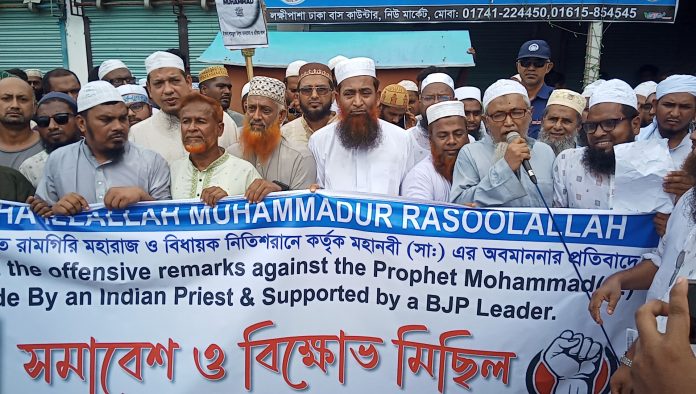 লোহাগড়া (নড়াইল) সংবাদদাতা॥ নড়াইলের লোহাগড়ায় বিশ্বনবী হযরত মুহাম্মদ (সা.)- কে ভারতীয় পুরোহিত রামগিরি মহারাজের কটূক্তি ও বিষয়টি নিয়ে ভারতের বিজেপি নেতা বিধায়ক নিতিশরান সমর্থন করার প্রতিবাদে সমাবেশ ও বিক্ষোভ মিছিল অনুষ্ঠিত হয়েছে।