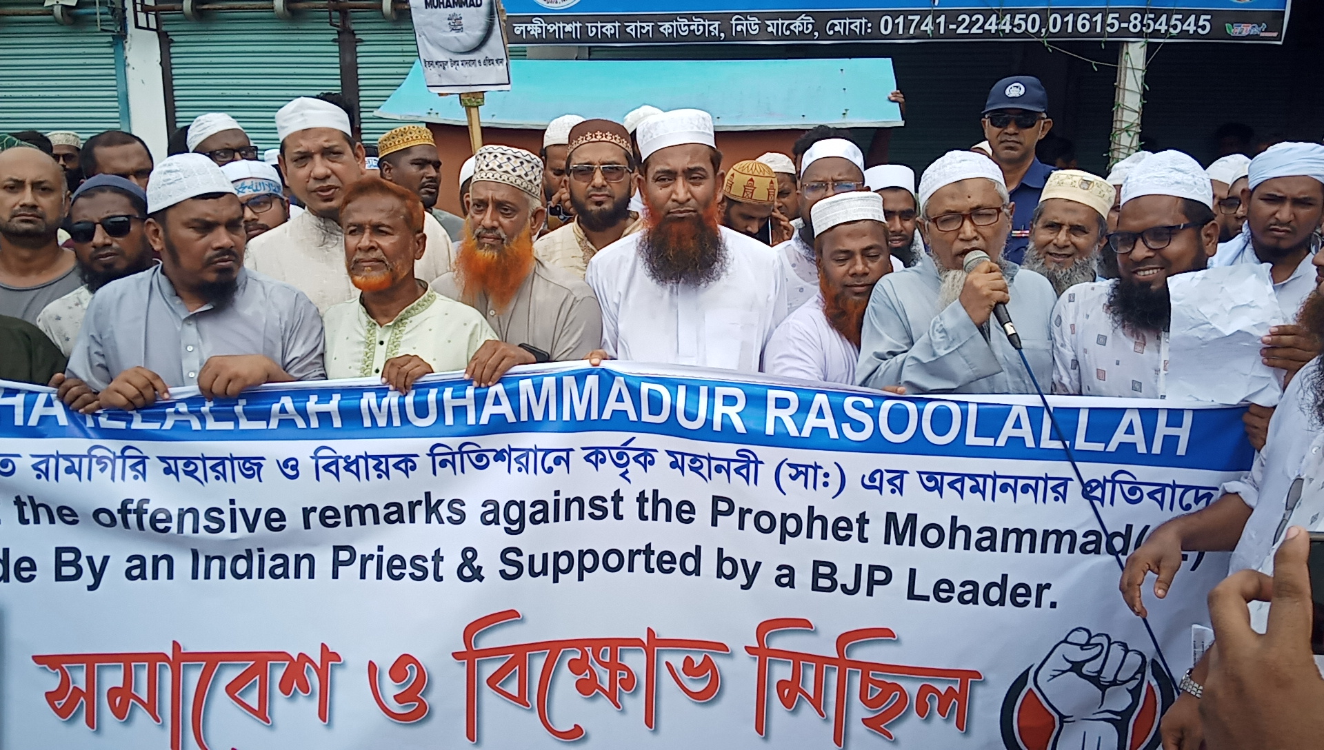 এরপর ওলামায়েকেরাম ও সর্বস্তরের তৌহিদী জনতার ব্যানারে ঈদগাহ থেকে বিশাল বিক্ষোভ মিছিল পৌর শহরের প্রধান প্রধান সড়ক প্রদক্ষিণ করে লক্ষীপাশা ঢাকা পরিবহন কাউন্টার সংলগ্ন নিউ মার্কেটে এসে শেষ হয়। এ সময় নিউ মার্কেট চত্বরে বিশাল এক সমাবেশ অনুষ্ঠিত হয়।