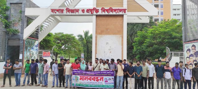 যবিপ্রবি সংবাদদাতা || যশোর বিজ্ঞান ও প্রযুক্তি বিশ্ববিদ্যালয়ে (যবিপ্রবি) ২০১৪ সালে ছাত্রলীগ কর্তৃক নির্মমভাবে খুন হওয়া পরিবেশ বিজ্ঞান ও প্রযুক্তি বিভাগের ২০০৯-১০ সেশনের শিক্ষার্থী নাইমুল ইসলাম রিয়াদ হত্যার বিচার ও ক্ষতিপূরণ দাবিতে মানববন্ধন করেছেন বিশ্ববিদ্যালয়ের বর্তমান ও সাবেক শিক্ষার্থীরা। দলীয় প্রতিপক্ষের হাতে খুন হয়েছিলেন ছাত্রলীগ কর্মী রিয়াদ।