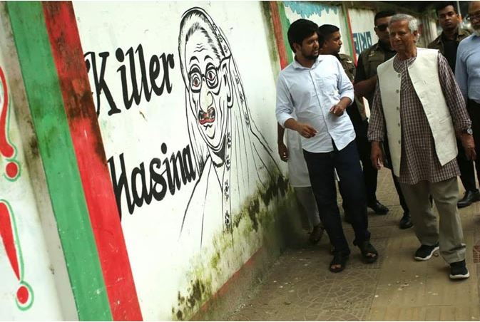 ঢাকা বিশ্ববিদ্যালয়ে তরুণ বিপ্লবীদের আঁকা গ্রাফিতি পরিদর্শন : ড.ইউনূসের