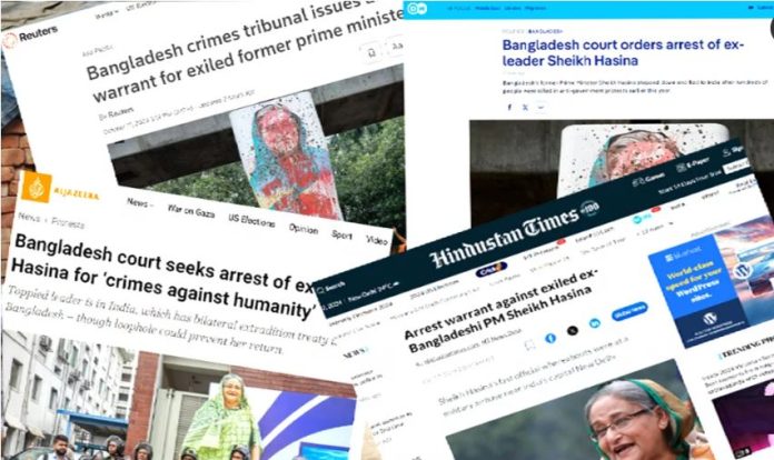 ব্রিটিশ সংবাদমাধ্যম বিবিসি শিরোনাম করেছে, শেখ হাসিনা: সাবেক নেতার বিরুদ্ধে বাংলাদেশের গ্রেপ্তারি পরোয়ানা জারি। অন্যান্য সংবাদমাধ্যমগুলোতেও শিরোনাম প্রায় একই রকম করা হয়েছে। ভারতীয় সংবাদমাধ্যমগুলোতে শেখ হাসিনার বিরুদ্ধে জারি করা পরোয়ানা নিয়ে একাধিক সংবাদ প্রকাশ করা হয়েছে।