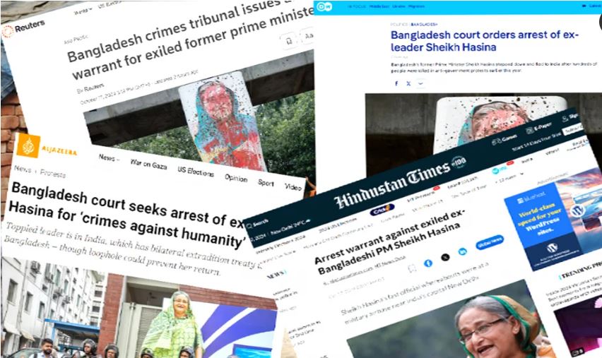 মার্কিন সংবাদমাধ্যম রয়টার্স তার শিরোনামে লিখেছে, নির্বাসিত সাবেক প্রধানমন্ত্রীর বিরুদ্ধে বাংলাদেশের অপরাধ ট্রাইব্যুনালের গ্রেপ্তারি পরোয়ানা জারি।