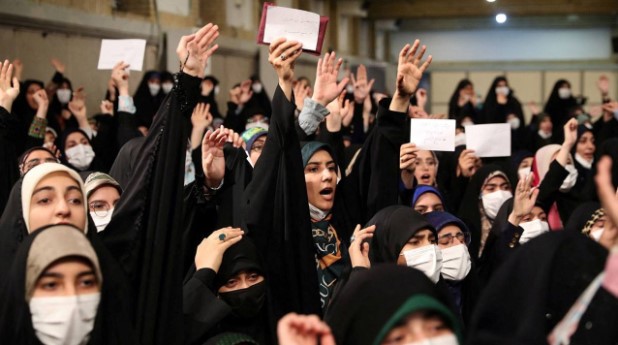 হিজাব ও বোরকা পরে আয়াতুল্লাহ খামেনির সঙ্গে দেখা করতে আসা নারীদের একটি দল।