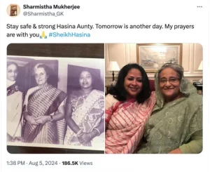 গত ৫ অগাস্ট যখন শেখ হাসিনা দিল্লিতে এসে নামলেন, সে দিনই সন্ধ্যায় দিল্লিতে কংগ্রেসের একদা মুখপাত্র শর্মিষ্ঠা মুখার্জি নিজের এক্স হ্যান্ডল থেকে একটি টুইট করেন।