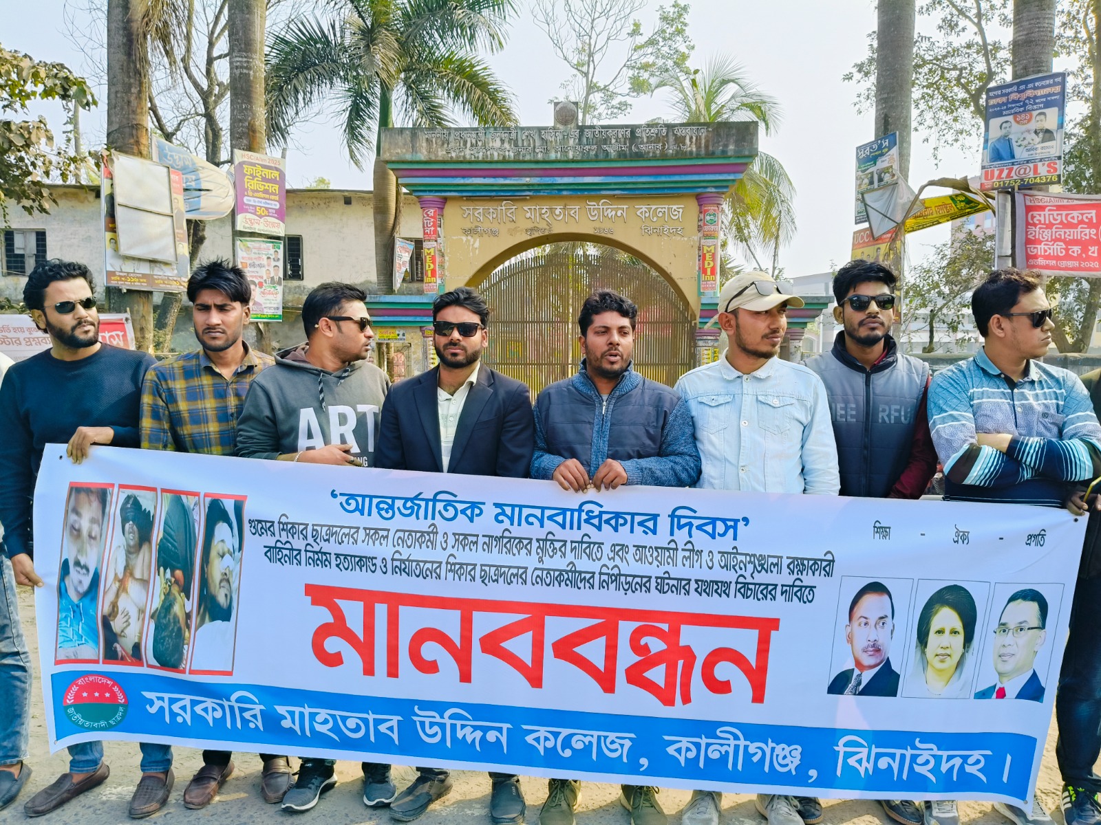 কালীগঞ্জ( ঝিনাইদহ) সংবাদদাতা॥ ঝিনাইদহের কালীগঞ্জে আন্তর্জাতিক মানবাধিকার দিবস উপলক্ষে মানববন্ধন হয়েছে। বুধবার সকালে সরকারি মাহতাব উদ্দিন কলেজ ছাত্রদলের আয়োজনে কলেজের প্রধন ফটকের সামনে যশোর-ঝিনাইদহ সড়কে মানববন্ধন হয়।