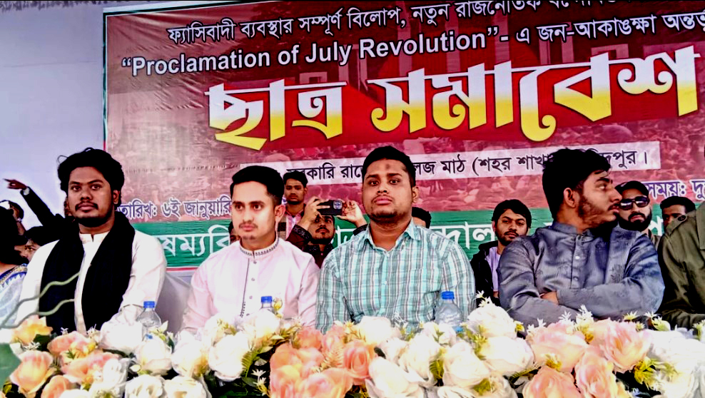 রাজেন্দ্র কলেজ মাঠের সমাবেশে বৈষম্যবিরোধী ছাত্র আন্দোলনের নেতৃবৃন্দ।
