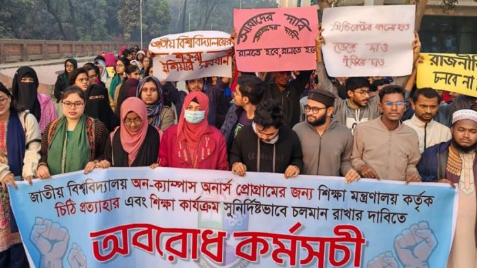 লোকসমাজ ডেস্ক॥ জাতীয় বিশ্ববিদ্যালয়ে অন-ক্যাম্পাস অনার্স প্রোগ্রামের শিক্ষা কার্যক্রম সুনির্দিষ্ট ভাবে চালানোর দাবিতে অবস্থান ধর্মঘট করছে শিক্ষার্থীরা।
