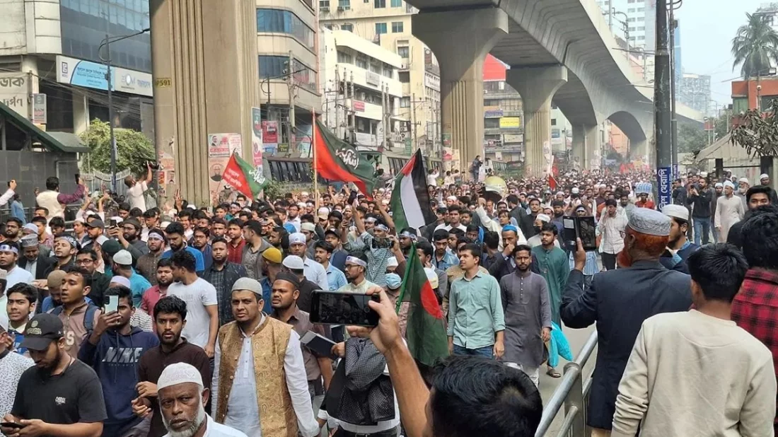 মিছিলের স্লোগান হলো, ‘আমার ভাই কবরে, খুনি কেন বাইরে’, ‘ফাঁসি ফাঁসি ফাঁসি চাই, শেখ হাসিনার ফাঁসি চাই’, ‘দিল্লি না ঢাকা, ঢাকা ঢাকা’, ‘নারায়ে তাকবীর, আল্লাহুআকবার’।