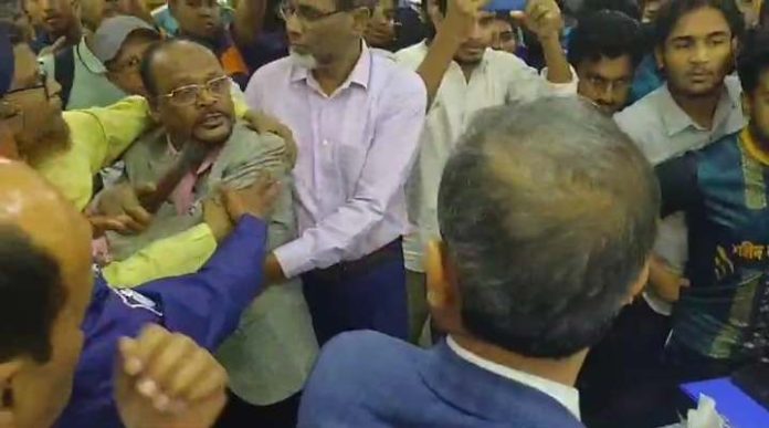 প্রত্যক্ষদর্শীরা জানান, উপউপাচার্য ও প্রক্টরিয়াল বডির মধ্যে বাকবিতন্ডার শুরু হয়। একপর্যায়ে সহকারী প্রক্টর অধ্যাপক ড. ফকরুল ইসলামকে ধাক্কা দেন উপ-উপাচার্য। উপ-উপাচার্য প্রক্টরকে ‘জামায়াত’ আখ্যা দিলে দুজনের মধ্যে উত্তপ্ত বাক্য বিনিময় হয়। তবে উপ-উপাচার্য এসব অভিযোগ অস্বীকার করেছেন।