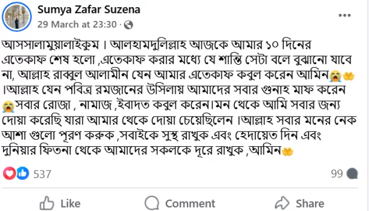 তিনি আরও লেখেন, ‘আল্লাহ রাব্বুল আলামীন যেন আমার ইতেকাফ কবুল করেন আমিন। আল্লাহ যেন পবিত্র রমজানের উসিলায় আমাদের সবার গুনাহ মাফ করেন সবার রোজা, নামাজ, ইবাদত কবুল করেন।’