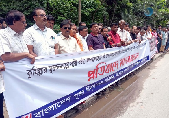 কুমিল্লার মুরাদনগরে নারী ধর্ষণ, লালমনিরহাটে ধর্ম অবমাননার অভিযোগে নরসুন্দর পিতা-পুত্রকে আটক এবং ঢাকার খিলক্ষেতে দুর্গাপ্রতিমা অসম্মানের প্রতিবাদে আয়োজিত মানববন্ধনে জেলা, উপজেলা ও পৌর কমিটির নেতৃবৃন্দ এবং সনাতন ধর্মাবলম্বীরা অংশ নেন। বাংলাদেশ মহিলা পরিষদ জেলা শাখার প্রতিনিধিও মানববন্ধনে সংহতি জানিয়ে বক্তব্য রাখেন।