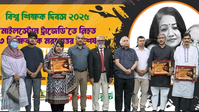 লোকসমাজ ডেস্ক ॥ শিক্ষক শুধু পাঠদান করেন না, তাঁরা হয়ে ওঠেন মানবিকতা, মূল্যবোধ ও সাহসিকতার অনন্য প্রতীক। বিশ্ব শিক্ষক দিবস ২০২৫ উপলক্ষে শিক্ষা বিষয়ক পত্রিকা ‘এডুকেশন ওয়াচ’ এবং এটিএন বাংলার ‘সময়রের সাথে’ অনুষ্ঠানের যৌথ আয়োজনে মাইলস্টোন ট্র্যাজেডিতে নিহত তিন শিক্ষিকাকে প্রদান করা হয়েছে মরণোত্তর বিশেষ সম্মাননা।