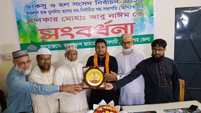 ঝিনাইদহ সংবাদদাতা ॥ ঢাকা বিশ্ববিদ্যালয় কেন্দ্রীয় ছাত্র সংসদ (ডাকসু) নির্বাচনে ফজলুল হক মুসলিম হলের নবনির্বাচিত সহসভাপতি (ভিপি) খন্দকার মো. আবু নাঈমকে সংবর্ধনা দেওয়া হয়েছে। বৃহস্পতিবার ঝিনাইদহ শহরের হামদহ এলাকায় এই সংবর্ধনা দেওয়া হয়।