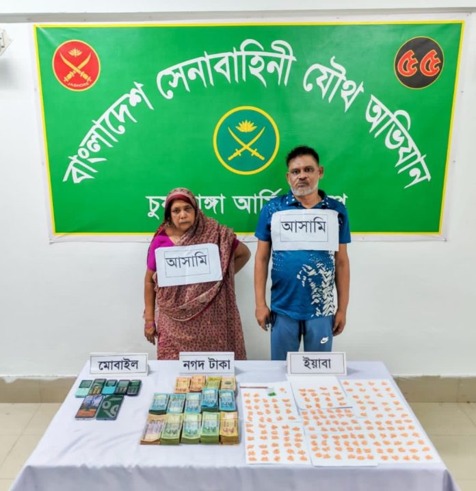 চুয়াডাঙ্গা সংবাদদাতা ।। চুয়াডাঙ্গায় এক যৌথ অভিযানে বিপুল পরিমাণ ইয়াবা ট্যাবলেট, নগদ টাকা, এবং মোবাইল ফোনসহ এক দম্পতিকে গ্রেপ্তার করেছে সেনাবাহিনী ও পুলিশ।
