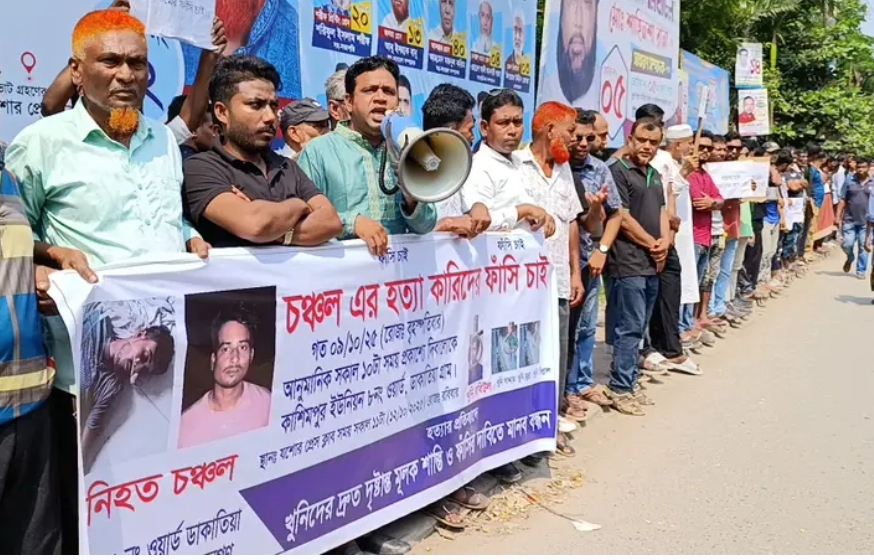 মানববন্ধনে বক্তারা বলেন, গত ৯ অক্টোবর (বৃহস্পতিবার) সকাল আনুমানিক ১০টার দিকে প্রকাশ্যে দিবালোকে ডাকাতিয়া গ্রামে চঞ্চলকে নৃশংসভাবে হত্যা করা হয়।  এ ঘটনায় জড়িত খুনিদের দ্রুত গ্রেপ্তার করে দৃষ্টান্তমূলক শাস্তি ও ফাঁসি নিশ্চিত করতে হবে।