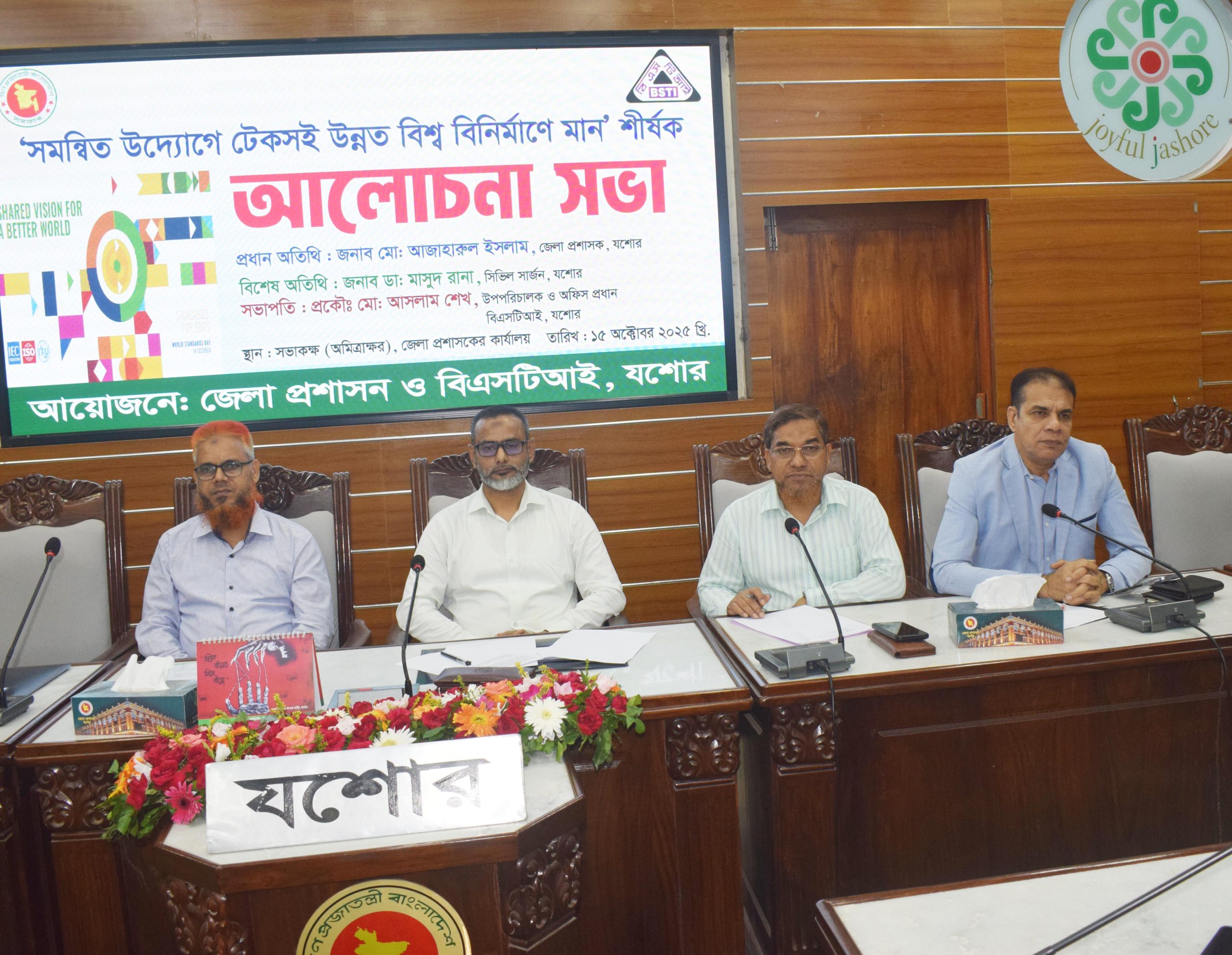 ‘সমন্বিত উদ্যোগে টেকসই উন্নত বিশ্ব বিনির্মাণে মান’ এই প্রতিপাদ্যকে সামনে রেখে আলোচনা সভার আয়োজন করে বাংলাদেশ স্ট্যান্ডার্ডস অ্যান্ড টেস্টিং ইনস্টিটিউশন (বিএসটিআই) যশোর আঞ্চলিক কার্যালয়। সভায় সভাপতিত্ব করেন বিএসটিআই যশোরের উপপরিচালক ও অফিস প্রধান প্রকৌশলী আসলাম শেখ। বিশেষ অতিথি হিসেবে উপস্থিত ছিলেন যশোরের সিভিল সার্জন ডা. মো. মাসুদ রানা, অতিরিক্ত জেলা প্রশাসক (শিক্ষা ও আইসিটি) খান মাসুম রেজা এবং যশোর চেম্বার অব কমার্স অ্যান্ড ইন্ডাস্ট্রির সভাপতি মিজানুর রহমান খান।