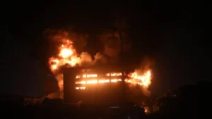 লোকসমাজ ডেস্ক ॥ চট্টগ্রামে রপ্তানি প্রক্রিয়াকরণ অঞ্চল (ইপিজেড) এলাকার ‘আদম ক্যাপ্স’ নামের একটি টেক্সটাইল কারখানায় ভয়াবহ আগুন লাগার পাঁচ ঘণ্টা পেরিয়ে গেলেও এখনো নিয়ন্ত্রণে আসেনি। সময়ের সঙ্গে সঙ্গে বাড়ছে আগুনের দাপট, ঘটছে একের পর এক বিস্ফোরণ। আগুনের তীব্রতায় ভবনের কয়েকটি দেয়াল ও উপরের তলা ভেঙে পড়েছে।