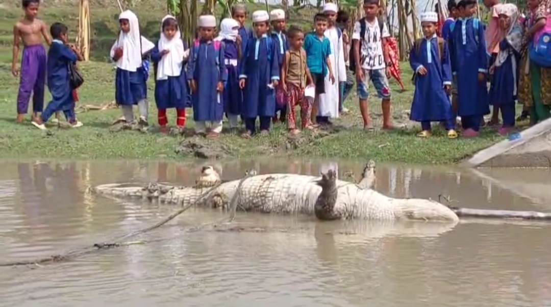 মোংলার খালে গলায় রশি বাধা মৃত কুমির