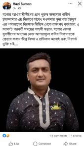 ইংরেজিতে হাজি সুমন লেখা নিজ ফেসবুক আইডিতে পলাতক আলমগীর কবির সুমন লিখেছেন, ‘যশোর আওয়ামী লীগের প্রাণপুরুষ জননেতা শাহীন চাকলাদারের নির্দেশে অবৈধ দখলদার সুদখোর ইউনুসের পদত্যাগের বিক্ষোভ মিছিল থেকে রাজপথ কাঁপানো, ৫ আগস্ট পরবর্তী সময়ের সাহসী সন্তান যশোর জেলা যুবলীগের অন্যতম নেতা আশরাফুল কবির শিকদারকে গ্রেফতার করায় তীব্র নিন্দা, প্রতিবাদ এবং নিঃশর্ত মুক্তি চাই’।