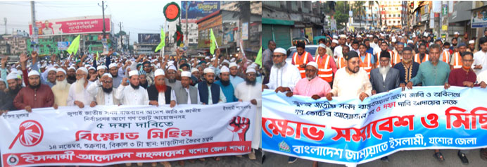 স্টাফ রিপোর্টার ॥ আসন্ন জাতীয় সংসদ নির্বাচনকে সামনে রেখে গণভোটের আয়োজন, জুলাই সনদের আইনি ভিত্তি নিশ্চিতকরণ ও প্রোপোরশনাল রিপ্রেজেন্টেশন (পিআর) পদ্ধতিতে জাতীয় নির্বাচন বাস্তবায়নের দাবিতে যশোরে ইসলামপন্থী দুটি রাজনৈতিক দলের পৃথক বিক্ষোভ সমাবেশ অনুষ্ঠিত হয়েছে।