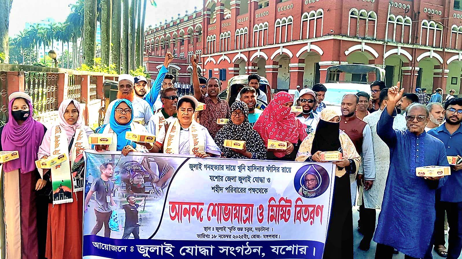 স্টাফ রিপোর্টার ॥ জুলাই গণহত্যাকারীদের বিরুদ্ধে দীর্ঘ প্রতীক্ষিত রায় ঘোষণার পর যশোরজুড়ে উৎসবমুখর পরিবেশ বিরাজ করছে। মঙ্গলবার (১৮ নভেম্বর) রায়ের প্রতি সমর্থন জানাতে জুলাইযোদ্ধা ও শহীদ পরিবারের উদ্যোগে শহরে আনন্দ শোভাযাত্রা বের হয়।
