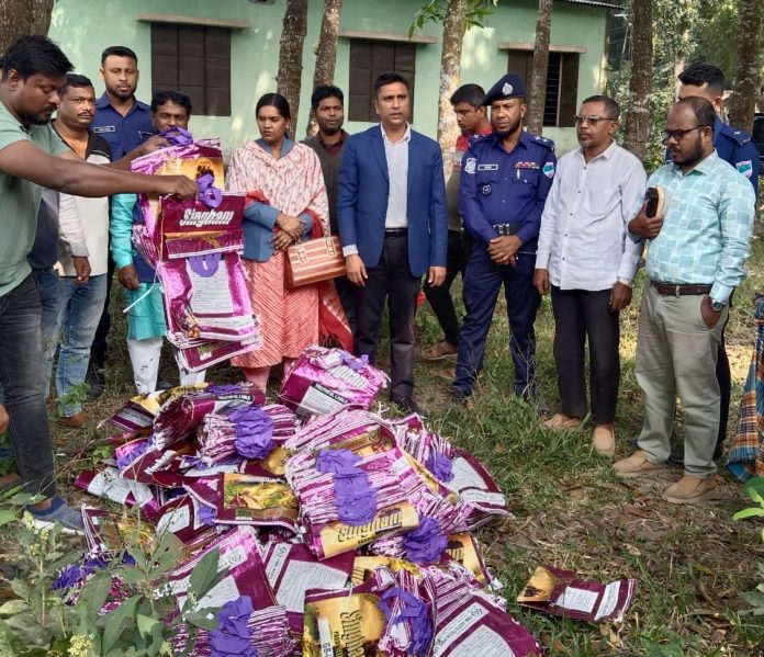 এ সময় দেখা যায় সুফলা বীজ ভান্ডারের মালিক স্বপন কুমার দেবনাথ অবৈধভাবে রড মিনিকেটসহ বিভিন্ন ব্র্যান্ডের ভারতীয় বীজ বিক্রির উদ্দেশ্যে গোডাউনে মজুদ করে রেখেছেন। এ কারণে তাকে ৫০ হাজার টাকা অর্থদন্ড প্রদান করা হয়।