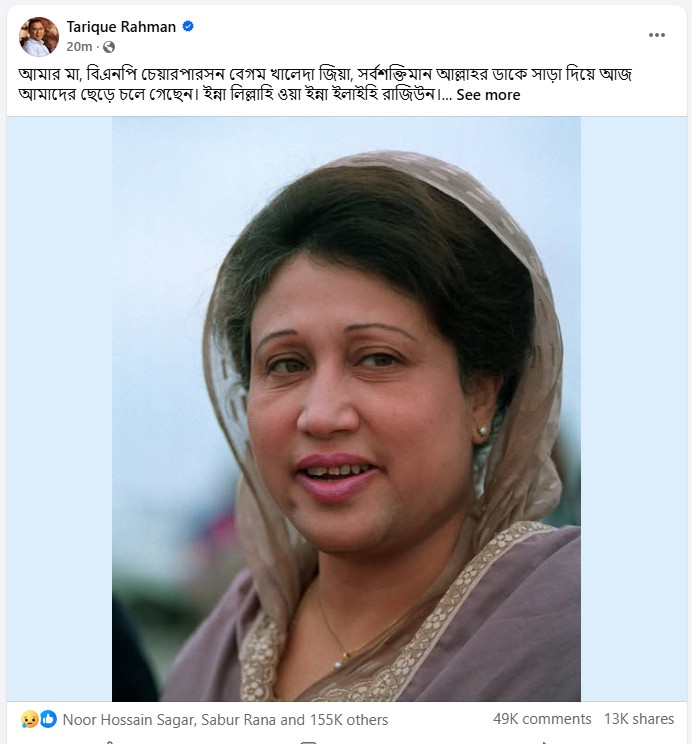 মা বেগম খালেদা জিয়ার প্রয়াণে শোকসন্তপ্ত তারেক রহমান; দেশবাসীর কাছে দোয়া চেয়ে সামাজিক যোগাযোগমাধ্যমে তাঁর বিশেষ বার্তা ।। ছবি: তারেক রহমানের ফেসবুক পেজ থেকে