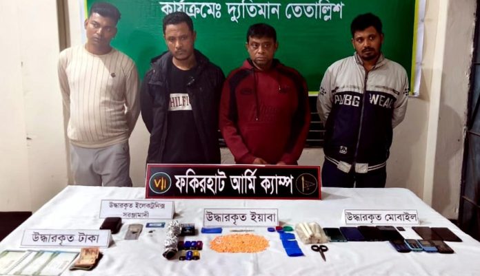 ফকিরহাট (বাগেরহাট)সংবাদদাতা ॥ ফকিরহাট সেনা ক্যাম্পের অভিযানে মাদক ও অন্যান্য সরঞ্জামাদিসহ চার মাদককারবারী গ্রেফতার হয়েছে।