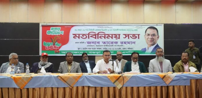 মতবিনিময় সভায় প্রধান অতিথির বক্তব্যে তারেক রহমান আসন্ন নির্বাচনের গুরুত্ব তুলে ধরেন। সভায় উপস্থিত কোনো কোনো নেতা মন্তব্য করেন, বগুড়ায় ধানের শীষের যে জনপ্রিয়তা, তাতে ভোটারের কাছে না গেলেও বিপুল ভোটে জয় নিশ্চিত।