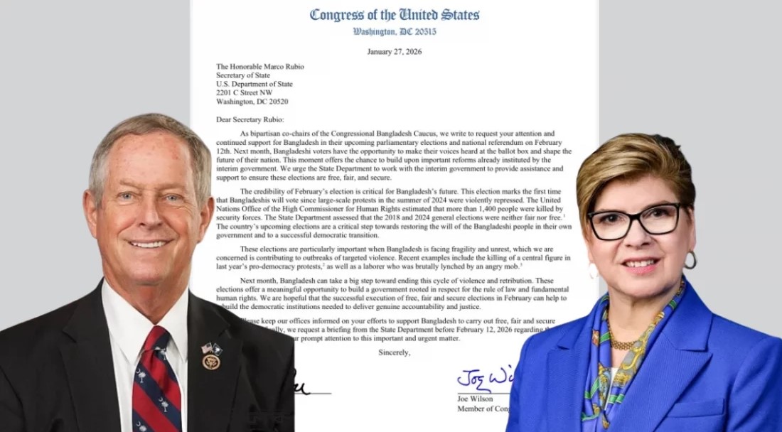 লোকসমাজ ডেস্ক ॥ দুইজন মার্কিন সিনিয়র কংগ্রেসম্যান জো উইলসন ও নাইল পাও বাংলাদেশে আগামী ১২ ফেব্রুয়ারি অনুষ্ঠিতব্য সাধারণ নির্বাচন ও গণভোট অবাধ, সুষ্ঠু ও নিরাপদ হওয়া নিশ্চিত করতে মার্কিন ককাসের ডেপুটি প্রধান মার্ক রুবিওকে চিঠি দিয়েছেন। তারা যুক্তরাষ্ট্রের পররাষ্ট্র দপ্তরের সক্রিয় ভূমিকা কামনা করেছেন।