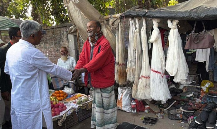 আজ সোমবার সকালে যশোর পৌর এলাকার রেলবাজারে সাধারণ মানুষ ও ব্যবসায়ীদের সাথে মতবিনিময়কালে ধানের শীষের প্রার্থী অনিন্দ্য ইসলাম অমিত।। ছবি: লোকসমাজ