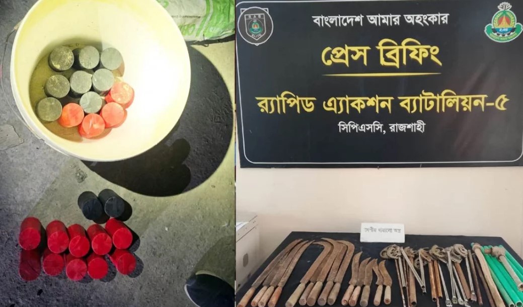রাজশাহীতে র‌্যাবের অভিযান ২৪টি ককটেলসহ দেশীয় অস্ত্র উদ্ধার
