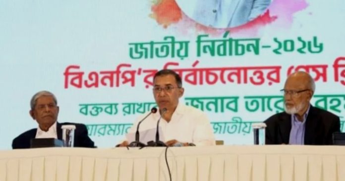 সংবাদ সম্মেলনের লিখিত বক্তব্য শেষে সাংবাদিকদের বিভিন্ন প্রশ্নের উত্তর দেন তারেক রহমান ও বিএনপির কেন্দ্রীয় নেতারা।