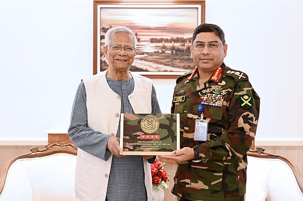 প্রধান উপদেষ্টা প্রফেসর মুহাম্মদ ইউনূসের সঙ্গে বিদায়ী সাক্ষাৎ করেছেন সেনাপ্রধান জেনারেল ওয়াকার-উজ-জামান।। ছবি: সংগৃহীত