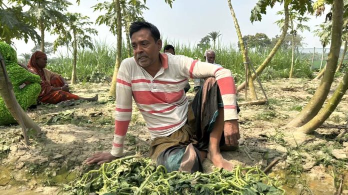 যশোরের ঝিকরগাছায় শত্রুতার জেরে এক ভূমিহীন কৃষকের আড়াই বিঘা শসা ক্ষেত কেটে দিয়েছে দুর্বৃত্তরা। ২ লাখ টাকার ক্ষতির মুখে নিস্ব কৃষক মোহর আলী।। ছবি: লোকসমাজ