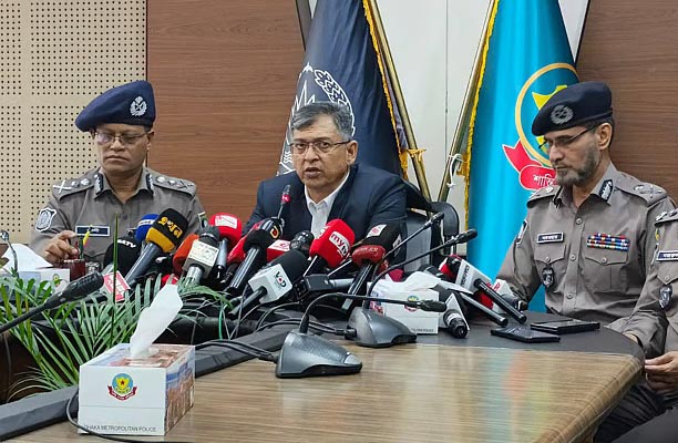 ডিএমপি সদর দপ্তরের ঊর্ধ্বতন কর্মকর্তাদের সঙ্গে মতবিনিময় সভা শেষে তৃতীয় তলার সম্মেলনকক্ষে সাংবাদিকদের মুখোমুখি হয়ে চাঁদাবাজ ও সন্ত্রাসীদের বিরুদ্ধে বিশেষ অভিযানের নির্দেশ দেন স্বরাষ্ট্রমন্ত্রী সালাহউদ্দিন আহমদ।। ছবি: সংগৃহীত