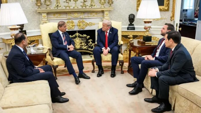 গত বছরের সেপ্টেম্বরে হোয়াইট হাউসে মার্কিন প্রেসিডেন্ট ডনাল্ড ট্রাম্পের সঙ্গে সাক্ষাৎ করেন পাকিস্তানের প্রধানমন্ত্রী শেহবাজ শরিফ ও সেনাপ্রধান ফিল্ড মার্শাল আসিম মুনির। ছবি: সংগৃহীত