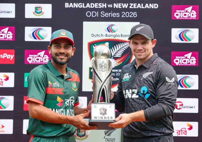 ওয়ানডে সিরিজের ট্রফি হাতে দুই দলের অধিনায়ক।। ছবি: সংগৃহীত