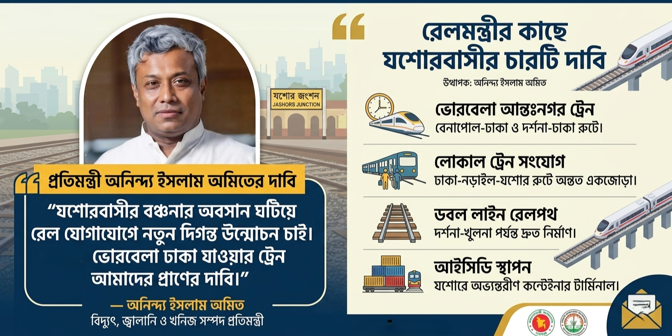 স্টাফ রিপোর্টার, লোকসমাজ : যশোরবাসীর দীর্ঘদিনের লালিত স্বপ্ন ও প্রাণের দাবি ভোরবেলা ঢাকা যাওয়ার ট্রেন। দক্ষিণ-পশ্চিমাঞ্চলের প্রবেশদ্বার হিসেবে পরিচিত যশোরকে ঘিরে রেলের বড় পরিকল্পনা থাকলেও অতীতে বরাবরই এ ধরনের অনেক বঞ্চনার শিকার হতে হয়েছে এই জেলাকে। এবার সেই বঞ্চনার অবসান ঘটাতে ও যশোরবাসীর দাবি বাস্তবায়নে সরাসরি রেলমন্ত্রীর হস্তক্ষেপ চেয়ে আধা-সরকারি পত্র (ডিও লেটার) দিয়েছেন বিদ্যুৎ, জ্বালানি ও খনিজ সম্পদ প্রতিমন্ত্রী অনিন্দ্য ইসলাম অমিত। ১৫ এপ্রিল ২০২৬ (০২ বৈশাখ ১৪৩৩) তারিখে রেলপথ মন্ত্রী শেখ রবিউল আলমকে দেওয়া ওই চিঠিতে প্রতিমন্ত্রী অমিত যশোরের প্রশাসনিক ও কৌশলগত গুরুত্ব অত্যন্ত জোরালোভাবে তুলে ধরেন। তিনি উল্লেখ করেন, যশোর বিমানবন্দর, বিমান বাহিনীর ঘাঁটি, সেনাবাহিনীর পদাতিক ডিভিশন এবং দেশের প্রধান স্থলবন্দর বেনাপোলসহ অর্থনীতির প্রাণকেন্দ্র নওয়াপাড়া ও ফুলের রাজধানী গদখালি এই জেলায় অবস্থিত।